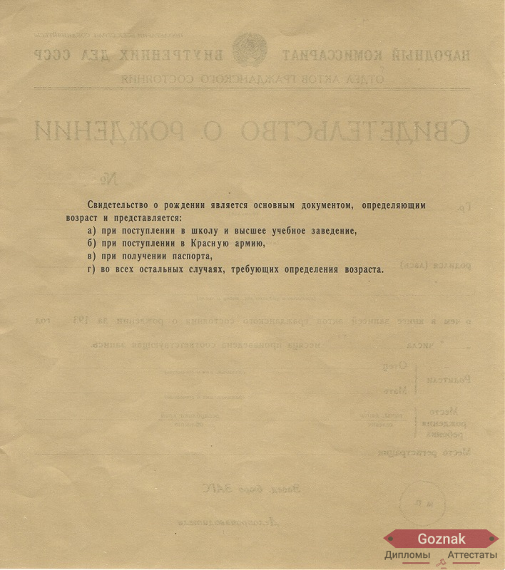 Компания «Гознак-Дипломы» успешно работает на рынке более 15 лет и предлагает Вам купить свидетельство о рождении СССР 1930 - 1939 гг. выгодно по хорошим ценам на настоящем бланке Гознак с оригинальными печатями и подлинными подписями. Документы имеют все степени защиты, оформлены по государственным нормам и с учетом особенностей конкретных учебных заведений. Свидетельства о рождении СССР 1930 - 1939 гг. на 100% соответствуют подлинникам, поэтому проблем точно не доставят, которые без опаски можно предоставлять в отдел кадров: