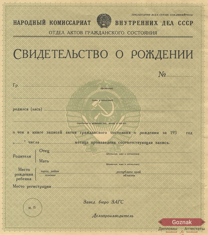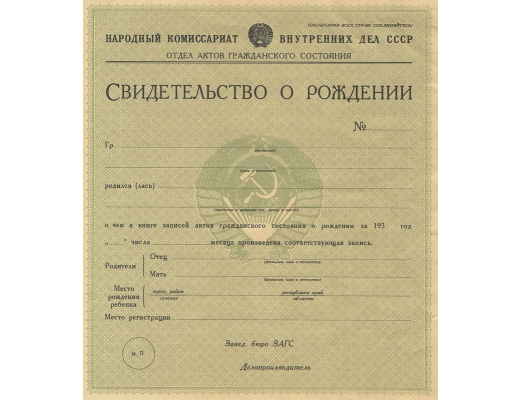 - При желании вы можете заказать свидетельство о рождении СССР 1930 - 1939 гг. времен СССР;