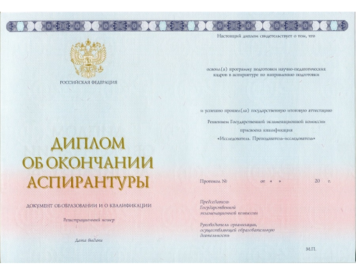 Диплом аспирантуры 2014 - 2026 гг. заполняется профессиональными специалистами по установленным правилам и нормам министерства образования РФ. Документ на 100% соответствует всем требованиями Министерства Образования и Науки РФ.