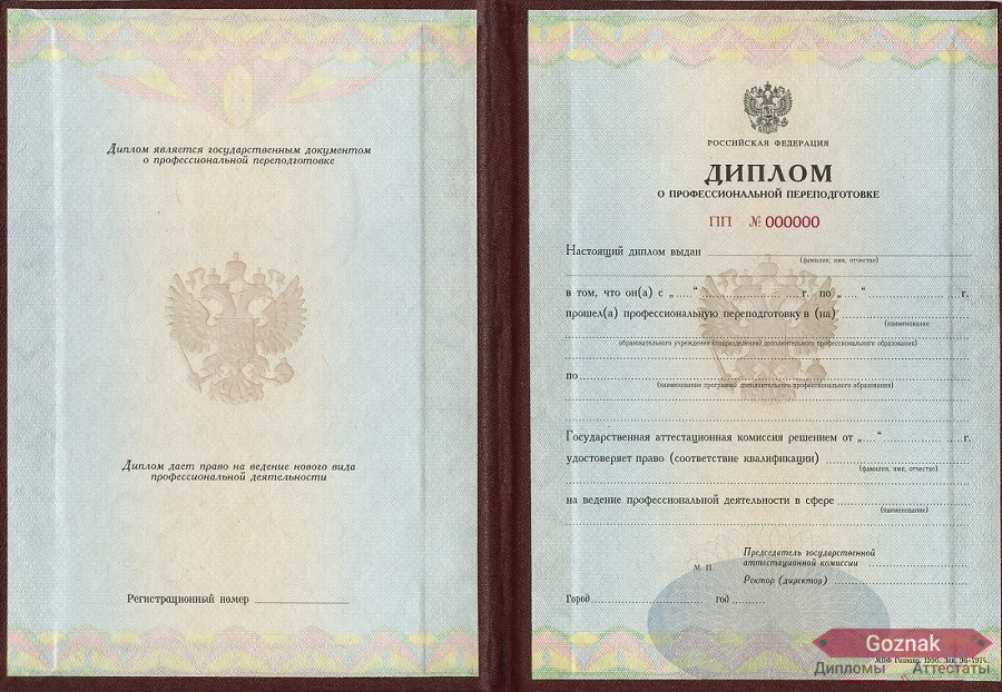 Компания «Гознак-Дипломы» успешно работает на рынке более 15 лет и предлагает Вам купить диплом о профессиональной переподготовке 1996 - 2012 гг. выгодно по хорошим ценам на настоящем бланке Гознак с оригинальными печатями и подлинными подписями. Документы имеют все степени защиты, оформлены по государственным нормам и с учетом особенностей конкретных учебных заведений. Диплом о профессиональной переподготовке 1996 - 2012 гг. на 100% соответствуют подлинникам, поэтому проблем точно не доставят, которые без опаски можно предоставлять в отдел кадров: